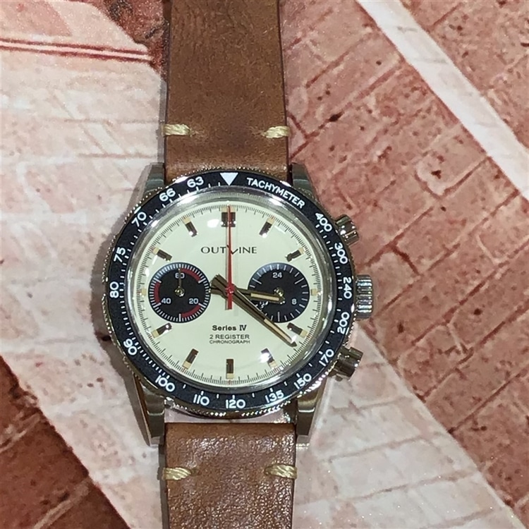 【仕様】メカクォーツ(セイコー製Cal.VK64)。クロノグラフ機構(9時位置に60分積算計)、24時間計(3時位置)
