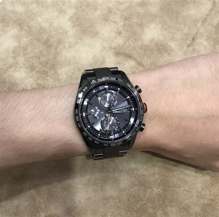 こちらのお時計は、ブラックボディにオレンジの差し色を採用したスポーティーなモデル。