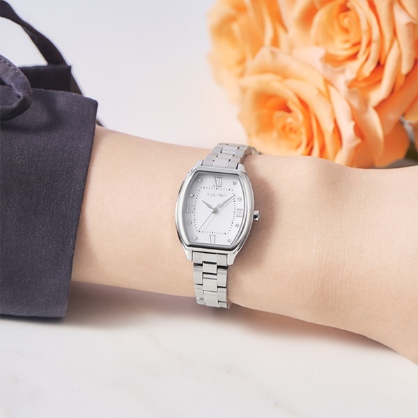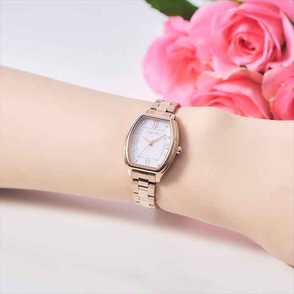 肌馴染みの良いピンクゴールドとホワイト文字盤に8石のクリスタルを施し、さりげなく手元を華やかにしてくれます♪