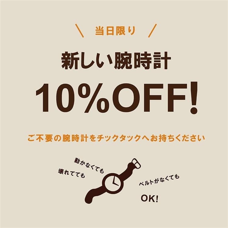 ご不要な腕時計1本下取りにつき新しい腕時計1本を10%OFF致します(一部割引除外商品あり)。
