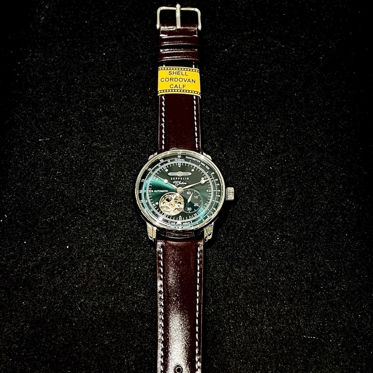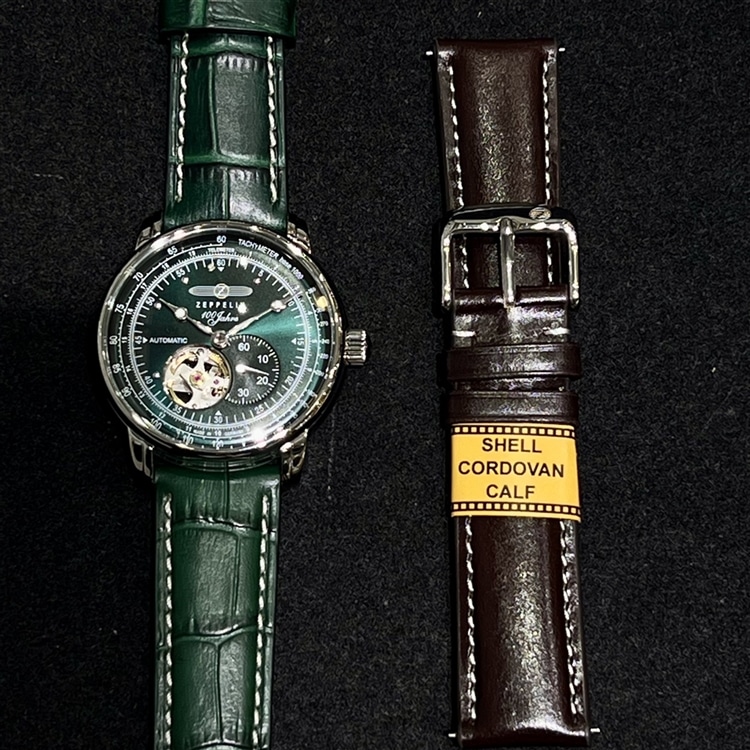 グリーンについてくるブラウンのベルトはシェルコードバンを使用しております。