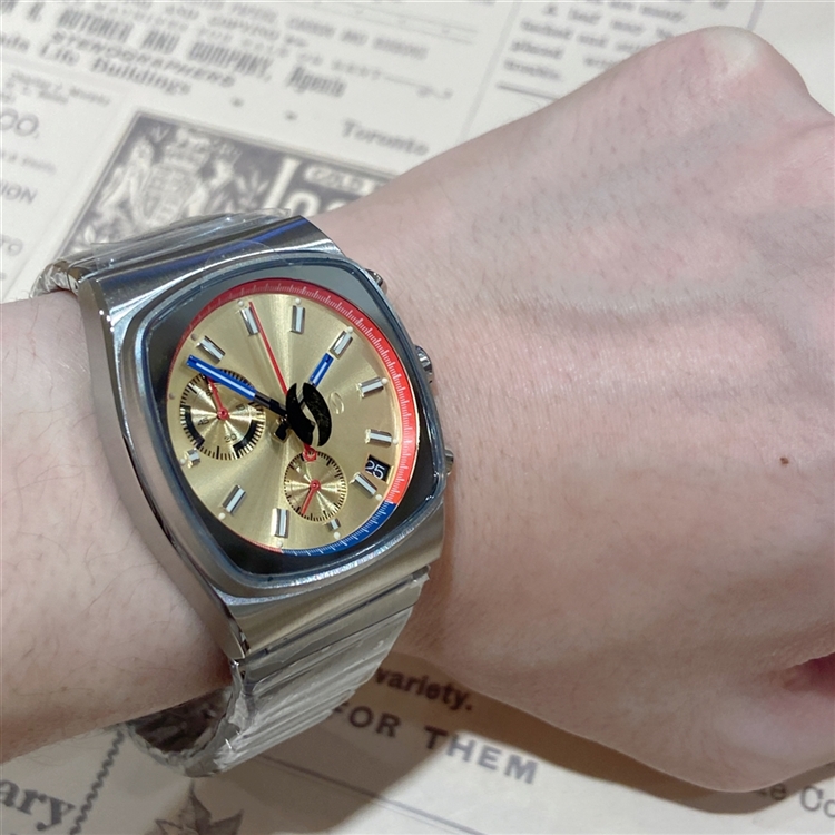 やはりゴールドの文字盤が最初に目に映ると思います。クッション型ケースに文字盤のデザインがレトロな雰囲気を醸し出していてとても可愛いです◎