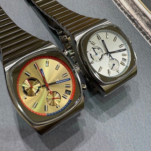 シルバーモデルは、「Metric」定番カラー。1970年代風トノー型ケースに垂直ヘアライン仕上げの銀色文字盤を合わせた、