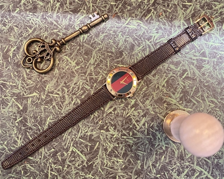 グッチのブランドカラーであるシェリーラインを取り入れたデザイン性の高いモデルはカジュアルスタイルにもドレスウォッチとしてもお使いいただけます♪