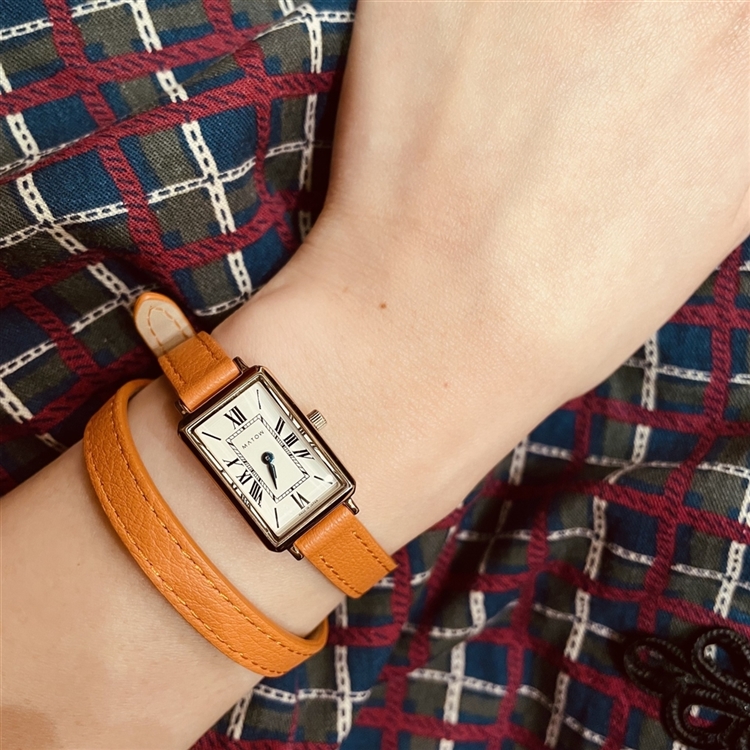 長めのレザーストラップが細くしなやかに2重に重なり、月が描く静かな流れのような優雅な印象に。