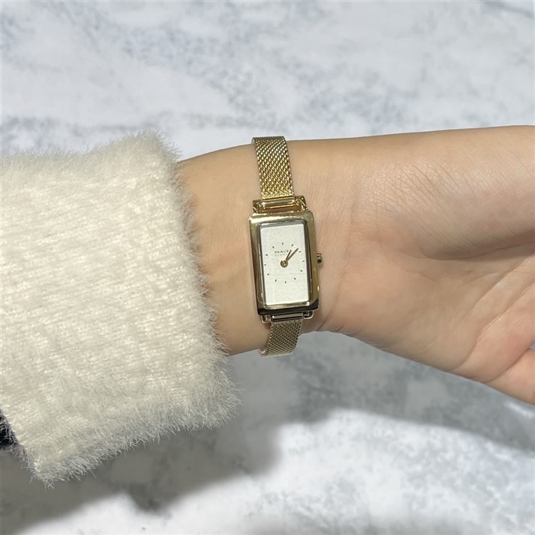 無駄を削ぎ落としたスクエア型ケースと、華奢なゴールドメッシュベルト。