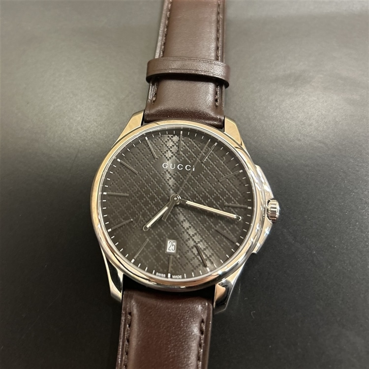 時代に左右されない普遍的な名作であり、「タイムレス(永久)」に使えるデザインのウォッチです。ひとめでグッチとわかるディアマンテ柄や文字盤全体のGシャドウがラグジュアリー感を演出し、グッチのアイコニックなモチーフ“ディアマンテ”を文字盤に施したコレクションです。落ち着いたダークブラウンの文字盤は抜け感があり、暖かみのある腕元を演出。40㎜のラージケースは腕元にさりげない存在感を放ち、耐久性と透明度に優れたサファイアクリスタル風防は無反射コーティングで視認性も抜群。ベルト裏にはグッチのロゴを型押ししたグッチシマを施し、細部までこだわりが感じられる一本です。