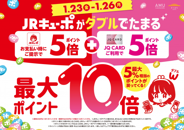 1/23(金)〜1/26(月)までの期間、JRキューポがWで貯まるキャンペーンを開催!!