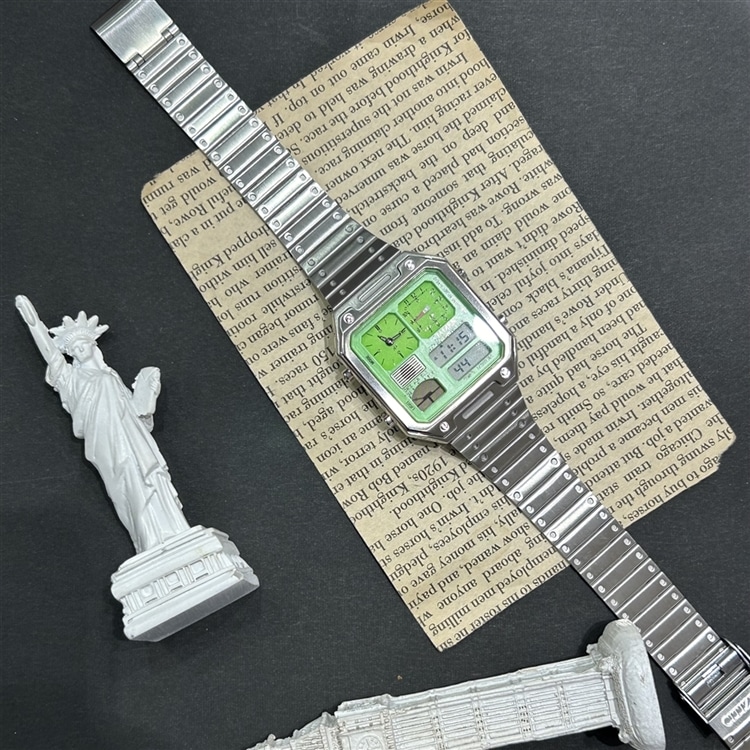- 文字板にTiCTACらしい深みのあるグリーンを採用しており、ケース、バンド、ベゼルはシルバーで統一されており、上品さとレトロな雰囲気がバランスよく組み合わされています。
