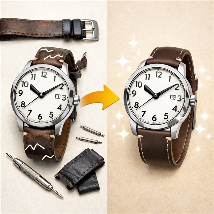 腕時計の革ベルトを交換すると、驚くほど印象が変わります。傷んだベルトを新しくするだけで清潔感がアップ。色や質感を替えれば、ビジネスにもカジュアルにも対応でき、時計を長く楽しめます。