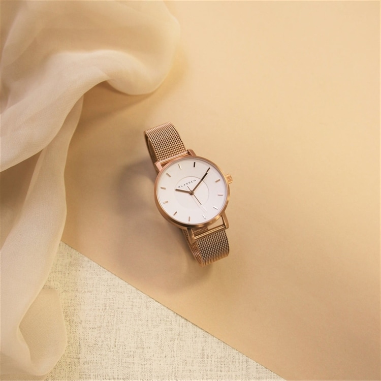 ツヤ感のあるホワイトのダイヤルとシャンパンゴールドのメッシュベルトが上品な印象のKLASSE14は、センスが良く、オススメの一本。TiCTAC限定モデルです。