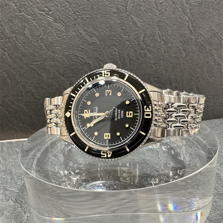 1970年代のヴィンテージスタイルをコンセプトにした「MARINE OFFSHORE / マリーンオフショア」。構想1年、製作2年の歳月をかけ、ようやく完成したテクネの新型はクラシックヴィンテージをコンセプトに、37㎜と小ぶりなケースサイズに、当時多く使われていたライスブレスレットを採用。(ベルト交換が簡単にできるレバーピン式バネ棒を使用)ガラスの淵から光を吸収するSUNBIRDソーラームーブメントに、200M防水のダイバーズ機能と反射防止サファイアガラスを搭載。強力な蓄光インデックスで視認性を高め、ステンレススチール316Lを使用。