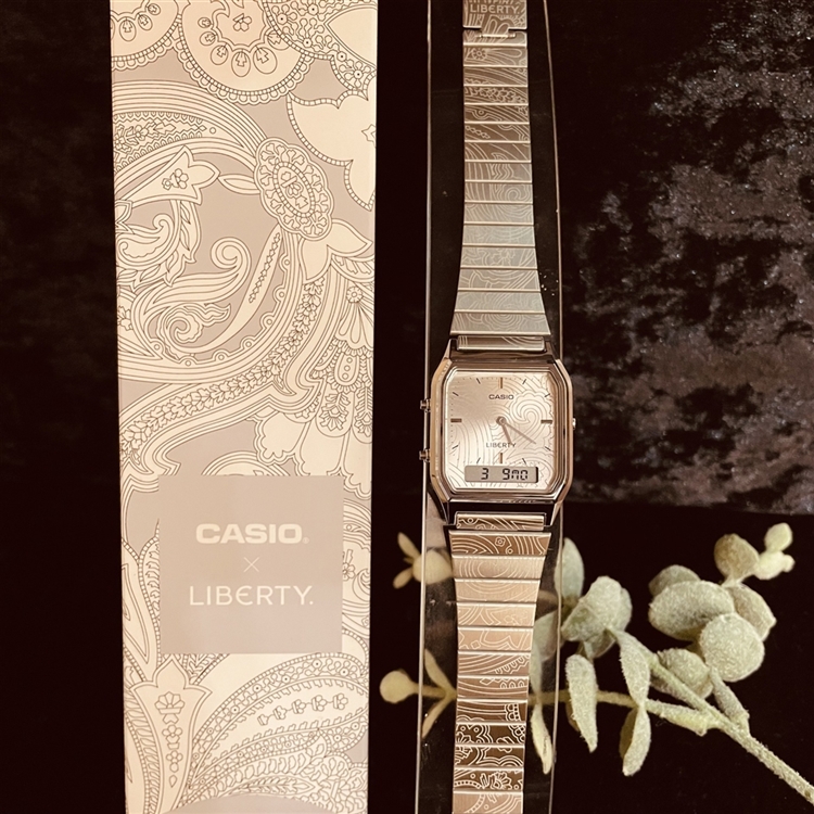 角型フェイスにアナログ時計とデジタル表示を組み合わせた、人気のAQ-230と英国老舗デザインハウスのリバティとのコラボレーションモデル。