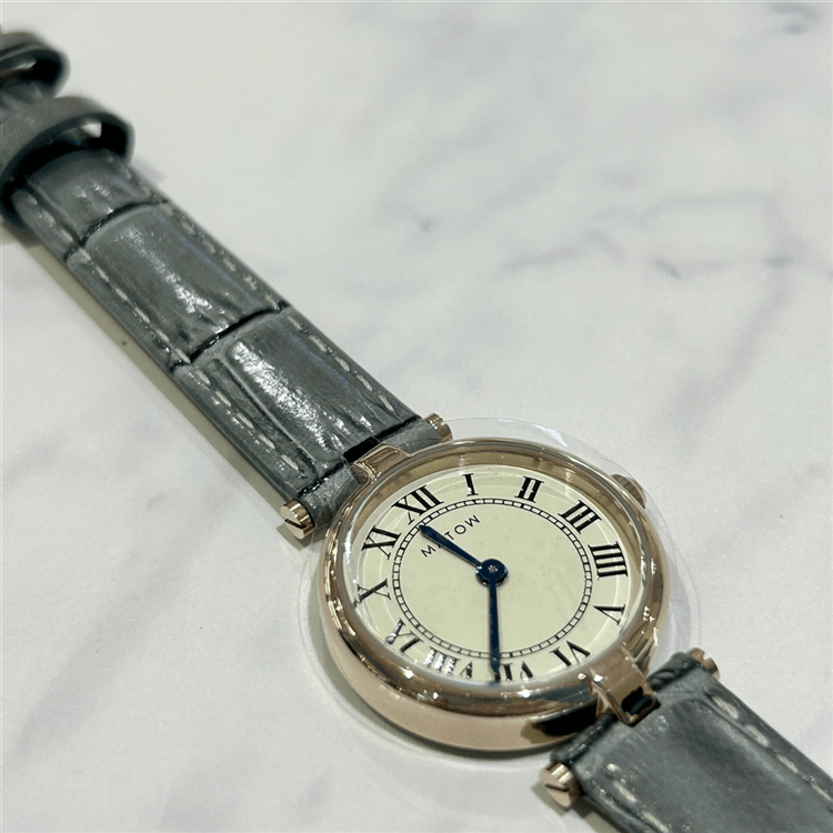 ローズゴールドのケースに、青みがかった明るいグレーのレザーベルトが映える1本。