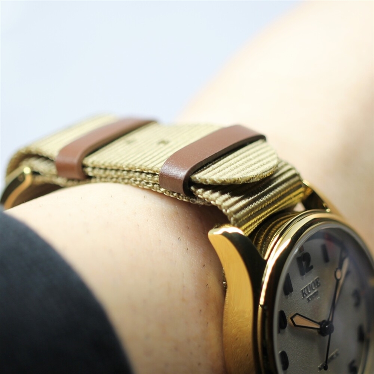 ナイロンベルトもグリーン一色ではなく、ブラウンを合わせて拘りの配色に。