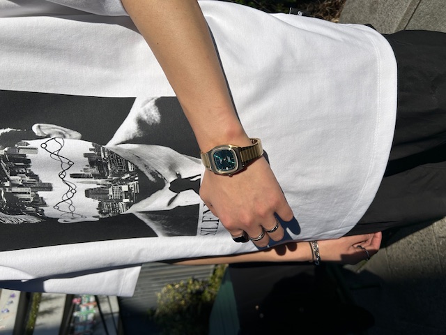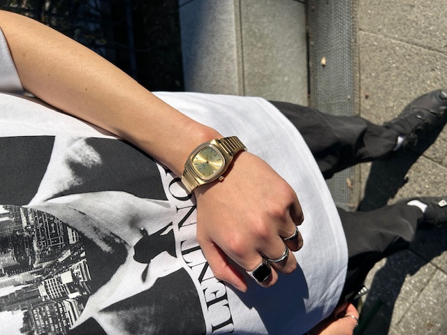 34mmのケースサイズ・ゴールドカラーがよりレトロ感を演出し、古着ファッションやジーンズと