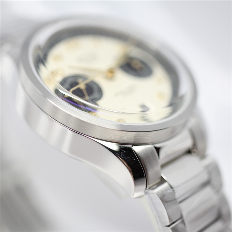 6時位置には「日付」とクオ初のトリプルカレンダーを採用した機械式腕時計となります。