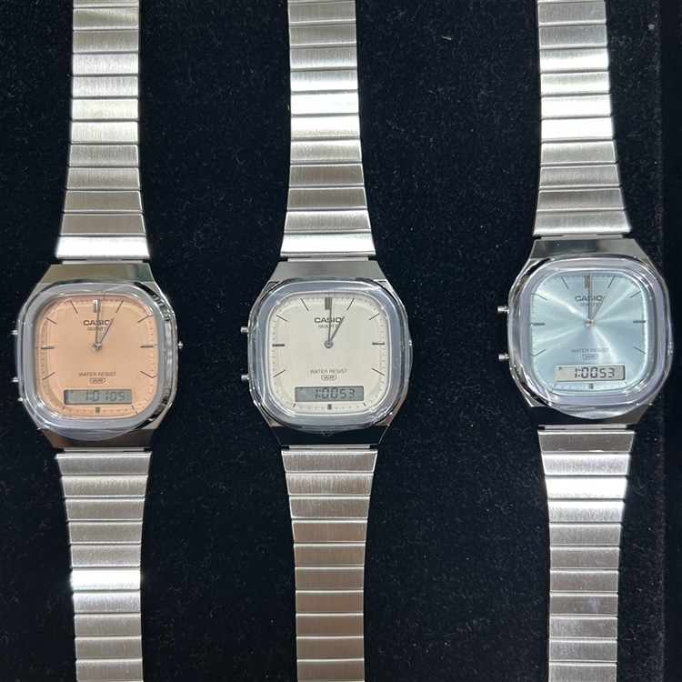 レトロモダンな装いのアナログ・デジタルコンビネーションモデルAQ-240に、ウォームトーンをテーマとしたカラーバリエーションを3色オフホワイト、サーモンピンク、ライトブルーをラインアップ。