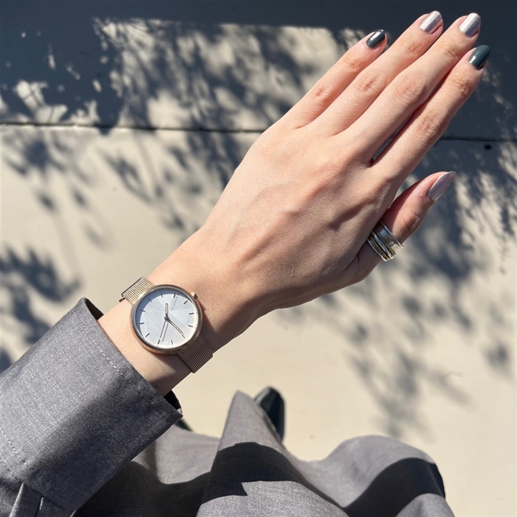 ネイビーの落ち着きに、ローズゴールドケースがほんのり華やかさをプラスしてくれるので、甘すぎず大人っぽく使える一本です。
