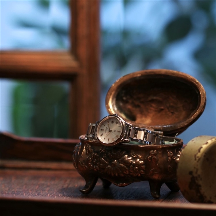 12時、6時、9時位置にひし形と丸型2種のカットパーツをセッティング、手元が動く度にジュエリーのように輝く1本。上品でフェミニンな見た目に、定期的な電池交換不要、いつでも正確な時間を刻んでくれる電波ソーラーを備えたシチズン「クロスシー」は、まさに才色兼備”という言葉がぴったり。