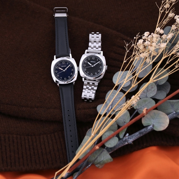 約30mmのサイズでヴィンテージ感のあるクッションケースがポイントのソーラーモデル。レイルウェイトラック※のインデックスでクラシックな雰囲気を表現。太陽光で充電ができる為、電池交換不要で実用性もバッチリ。オシャレを楽しみたい秋冬に、この一本があればもっとファッションを楽しめそう。