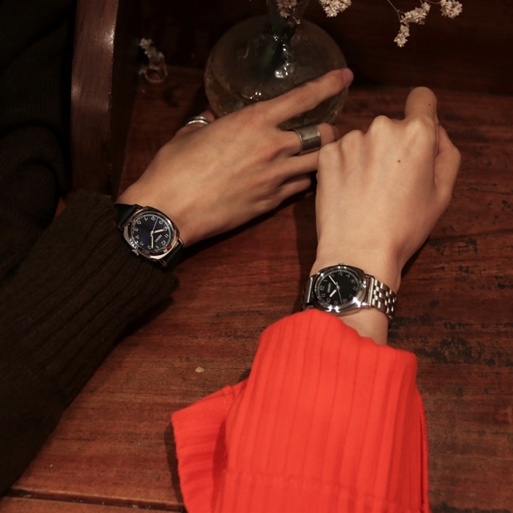 シルバーケースと暗めのダイアルカラーが大人なペア。通年使いやすい色合いですが、ブラウンや赤などの暖色系の秋っぽいアイテムと合わせることで、よりこなれ感のあるコーディネートに。今年のトレンドカラーとの相性も期待できそう。