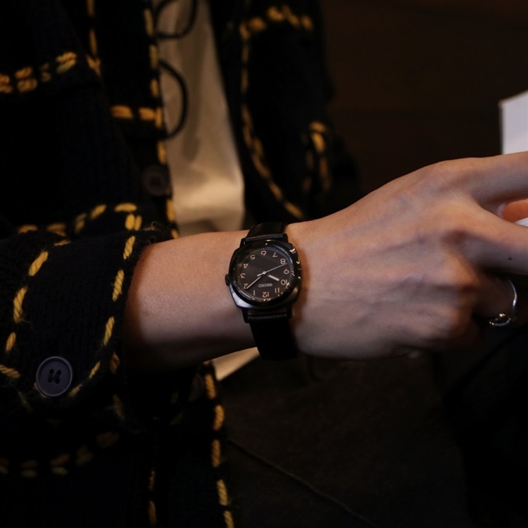 ブラックのIPケースにピンクゴールドインデックスを合わせたモデル。レディースではオールブラックだと少しクールな印象になりますが、メンズではピンクゴールドのアラビア数字がかわいらしい印象に。ニットのカーディガンと合わせたコーディネートがオススメ。