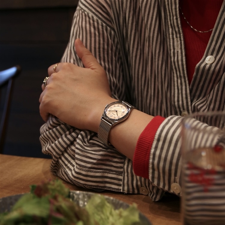 レディースにオススメな2モデル。左は現行では他にないステンレスのメッシュバンドを採用したモデル。うっすらとピンクがかった文字盤が特徴の華やかな一本。右はイエローゴールドと暗いブラウンのレザーを組み合わせたソーラーモデル。キレイ目な大人っぽいスタイリングとの相性がよく、週末のお出かけでも活躍してくれること間違いなし。