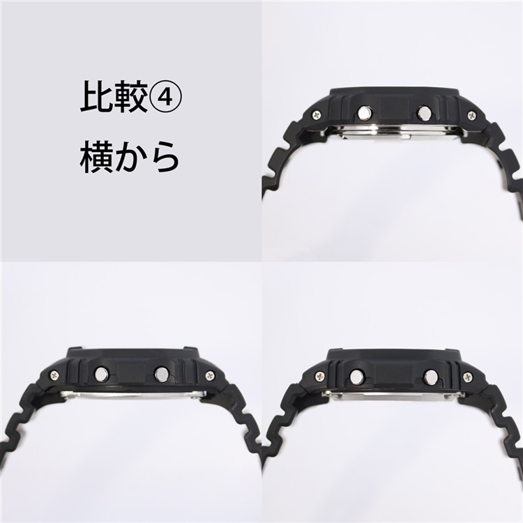 あまりなかった横からの見た目を比較してみました。厚みはほぼ同じ(誤差±1mm以下)であり、着け心地については裏蓋のデザインに左右される印象。下2モデルについては、ベゼル部分に若干のふくらみがあります。比較①の正面から見た際の『PROTECTION』と『G-SHOCK』ロゴが入った上下の部分が少しだけ強調されたデザインになっており、対称に「DW-5000R(右上)」のベゼル部分はフラットな仕様で、これはオリジナルモデルを忠実に再現しています。また、よく見るとプッシュボタン位置が多少異なりますが、恐らくモジュール(中身の機械)の違いによる若干の縮尺違いによるものです。
