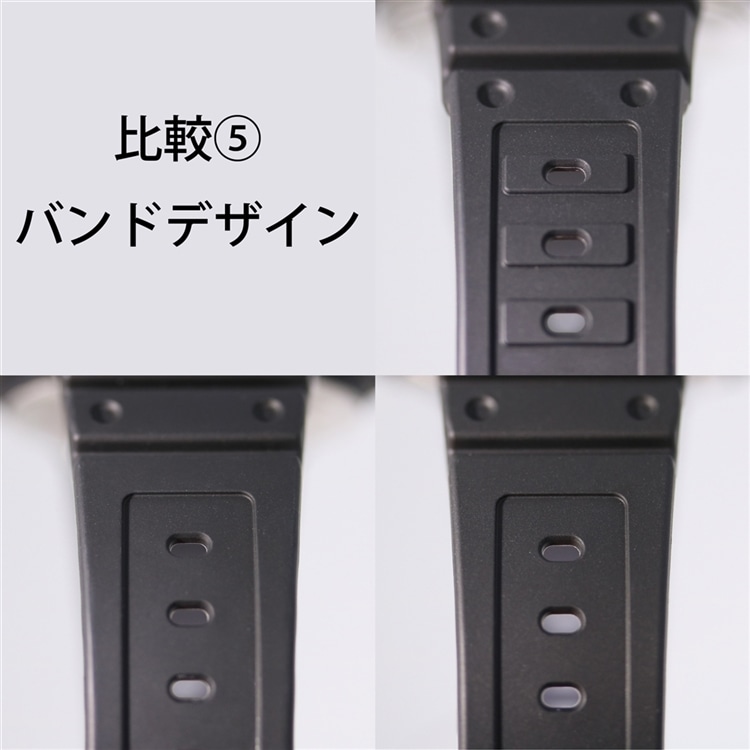 今度はバンドデザインとバックル部分をまとめて。「DW-5000R(右上)」はバンドの長さ、形状、ディンプルの位置までオリジナルモデルを再現。40年の時を経て初志に立ち返り、未来を切り拓こうとする“G-SHOCK”の決意を表しています。下2モデルは多くのモデルで共通に使用されている一般的なデザインです。バックル、游革はどれも汎用的なパーツであり、共通と思われます。