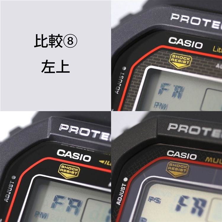続きまして、ケース左側にズームしてみます。比較⑧左上にある『CASIO』のロゴや「SHOCK REGIST」表記はサイズ、位置ともにほぼ同じ。左上のプッシュボタンもすべてのモデルで「ADJUST●」(時刻調整)用として共通のようです。また、比較⑨左下の「WATER REGIST 20BAR」表記もサイズ、位置ともに同じ。(ピンぼけで見づらく申し訳ないのですが)左下のプッシュボタンも「●MODE」(モード切替)用として共通。違いを探るとすれば「GW-M5610U(右下)」の「SNZ/ALM/SIG」モード表示があること。さらによく見ると、液晶周りの白枠が「DW-5000R(右上)」だけ少しカーブがキツくなっているようです。
