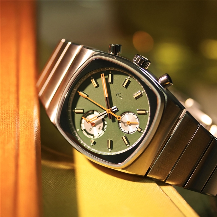 今作は日本の伝統的な【松葉色】や【柳色】を思わせる淡いグリーンをダイアルカラーに採用。針には【橙色】、インデックスには【蒸栗色】のようなマットなベージュカラーを施し、和のテイストを表現しています。ブランドコンセプトである“Brew time”(エスプレッソの適正抽出時間である25~35秒)はインナーリングのカラーを反転させた仕様に。