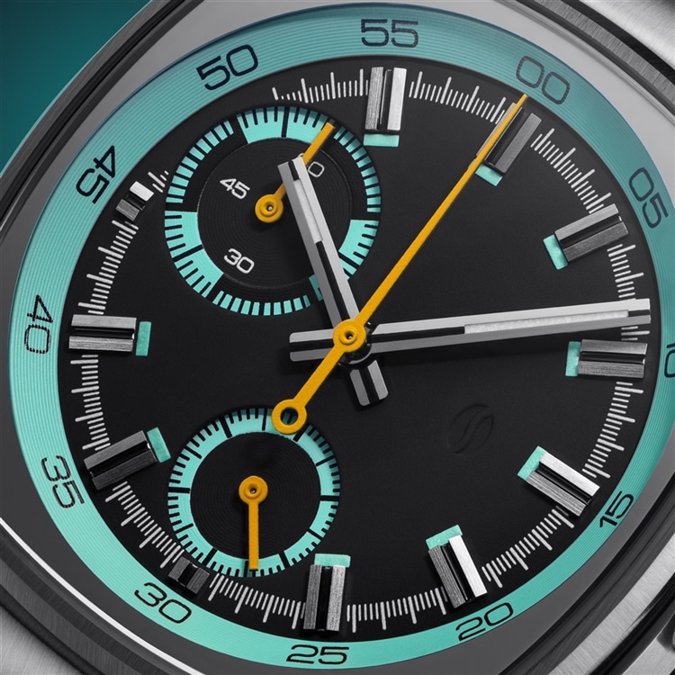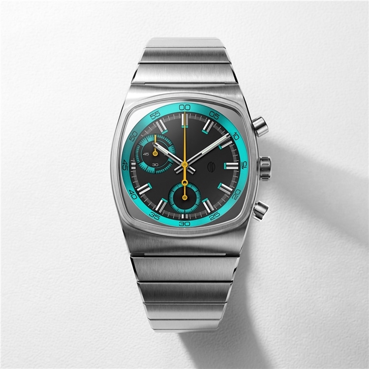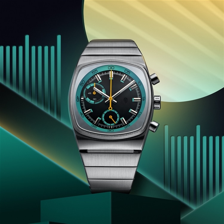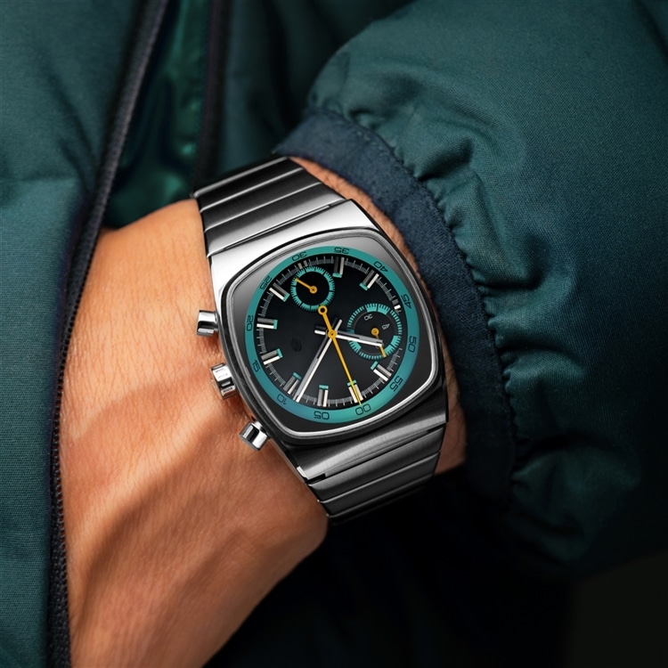 ベースモデルは、70年代のようなブラウン管を彷彿とさせるケースを採用したMetricシリーズ。洗練された計器のようなインダストリアルの見た目と、ティール&ブラックに差し色のイエローがフューチャリスティックに融合したデザイン。
