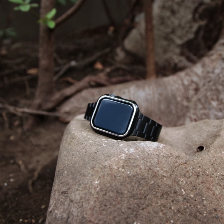 ブラックのIP加工が施された、シンプルさ3連ブレス。カジュアルな印象になりがちなアップルウォッチですが、ブラックのハードカバーと合わせてクールな印象に。
