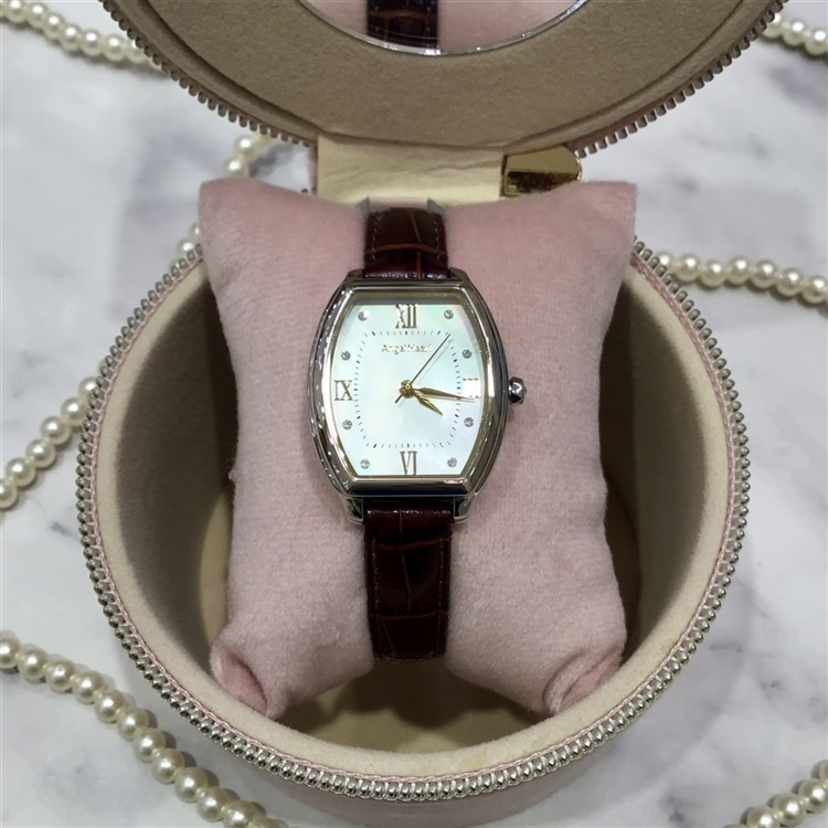シェル文字盤の可愛らしいフェイスとほのかに光沢感のあるブラウンレザーの組み合わせが