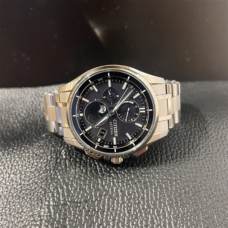 アナログ式光発電腕時計で世界初*、月齢自動計算機能「ルナプログラム」が搭載されており、6 時位置のムーンフェイズ部分に月齢をが自動表示されることが大きな特徴となっております。