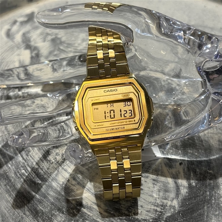 デジタルウォッチのデザインを金色メタルの上品な質感で仕上げた「CASIO CLASSIC A1000G-9JF」。