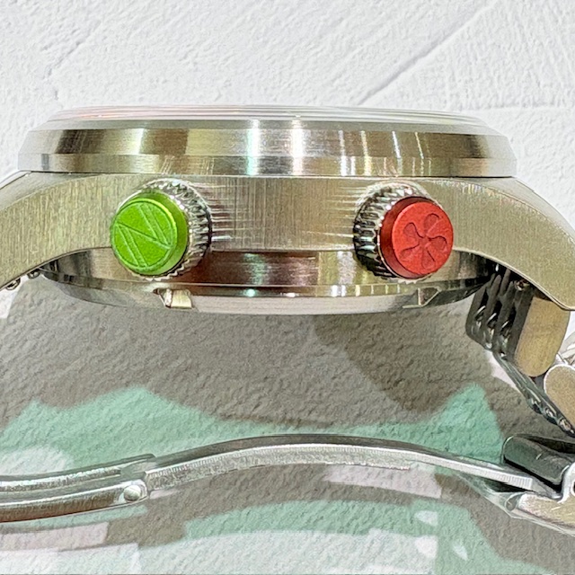 さらに2時位置と4時位置、双方のリューズトップにキャラクターをモチーフとしたカラーリングも施しています。