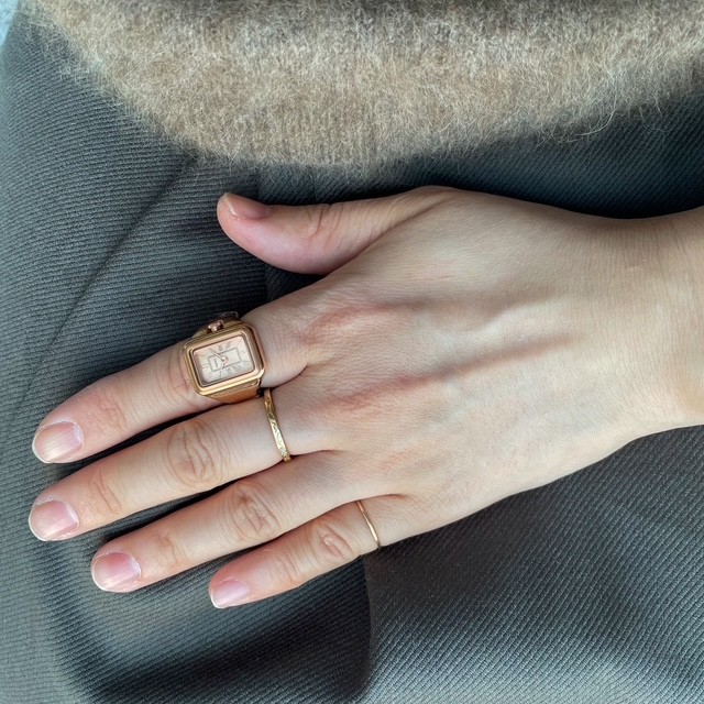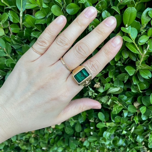 こちらは一見するとグリーンストーンの指輪のようで、実はこっそり時計というのが隠されたおしゃれで素敵ですよね。