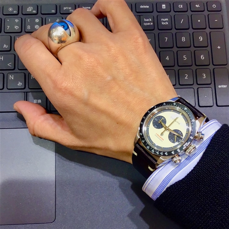 【仕様】メカクォーツ(セイコー製Cal.VK64)。クロノグラフ機構(9時位置に60分積算計)、24時間計(3時位置)