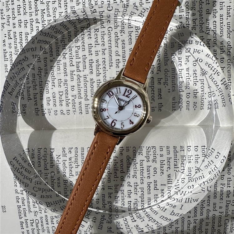 先カンはレバー付きばね棒のため、革バンドの着せ替え対応モデルです。(9mm幅)針、インデックスにはダークカラーを採用することで、今までのモデルよりもかわいらしさはそのままに、視認性をUPしました。