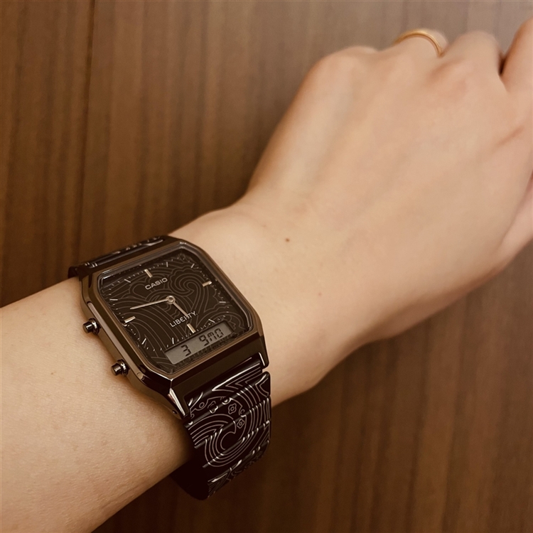 角型フェイスにアナログ時計とデジタル表示を組み合わせた、人気のAQ-230と英国老舗デザインハウスのリバティとのコラボレーションモデル。