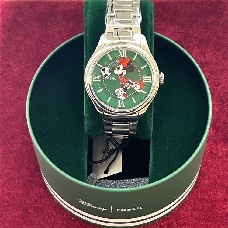 ディズニーのミニーマウスがサッカーのMVPとして活躍する、限定エディションのベストセラーGILMOREウォッチ。クラシックな38mmのラウンドダイヤルに、ポリッシュ仕上げのステンレススチール製ケースとブレスレットが配されています。鮮やかなグリーンのサンレイ仕上げダイヤルには、サッカーにインスパイアされたアクセントが施され、遊び心がありながらも洗練されたデザインに仕上がっています。分刻みで個性を発揮するモダンなコラボレーションとなっております。