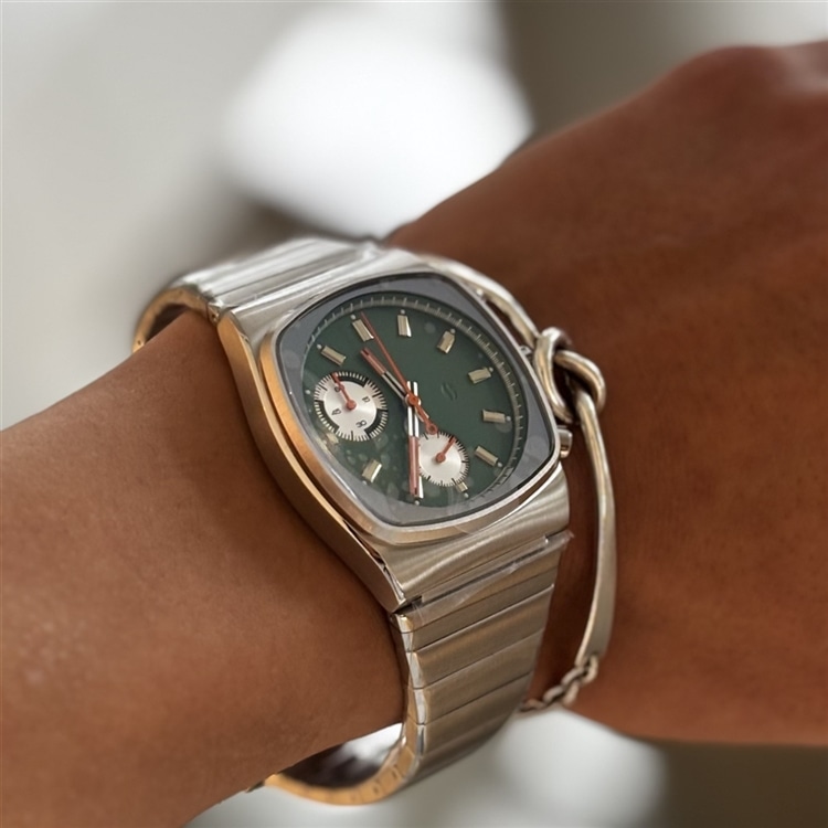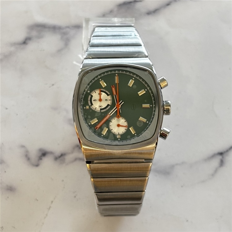 落ち着いた淡いモスグリーンのダイヤルに、クリーム色の蓄光塗料とオレンジの針が映えるデザイン。