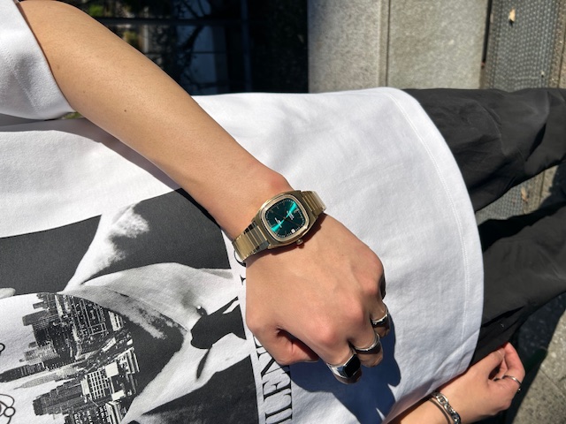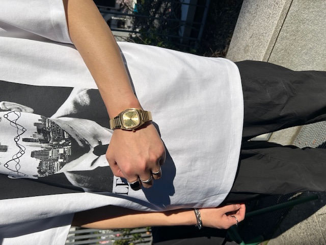 34mmのケースサイズ・ゴールドカラーがよりレトロ感を演出し、古着ファッションやジーンズと