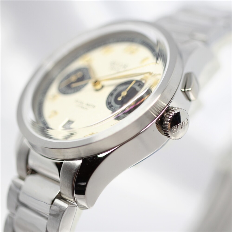 6時位置には「日付」とクオ初のトリプルカレンダーを採用した機械式腕時計となります。