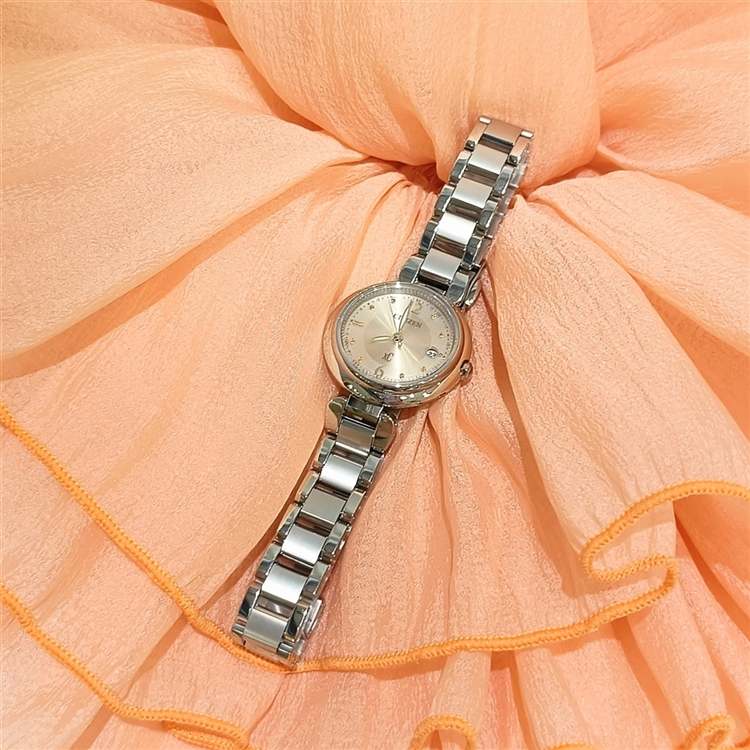 爽やかなライトシルバーのケースに、肌なじみの良いピンクベージュの文字板を合わせて優しい印象に仕上げました。