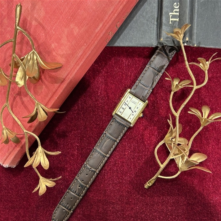その最大の魅力は、伝統ある「タンク」の美学を、シルバー925に18金を厚く重ねた「ヴェルメイユ」技法によって、より身近に楽しめる点にあります。現行モデルにはない多彩な文字盤のデザインや、アンティーク特有の柔らかな風合いは、手元に唯一無二の個性を添えてくれます。