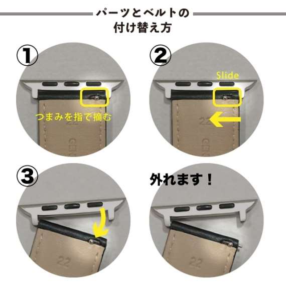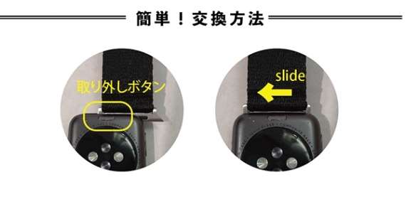 <交換方法>[取り外しボタン]を押しながらベルトを横にスライドさせて取り外し・取付を行います。