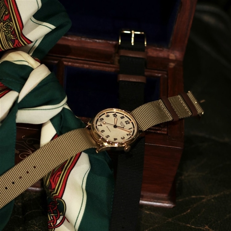 京都発のクラシックウォッチブランドKUOE(クオ)の、5周年を記念したTiCTAC別注モデル。1940-70’sのイギリス軍ミリタリーウォッチにインスパイアされた自動巻きモデルをベースに、他にはないゴールドケースをオーダー。カジュアルな印象になりがちなNATOベルトも、ゴールドケースに合わせることで上品なアイテムに。 ベルトを付け替えることでまったく違う表情を楽しめるのが魅力。